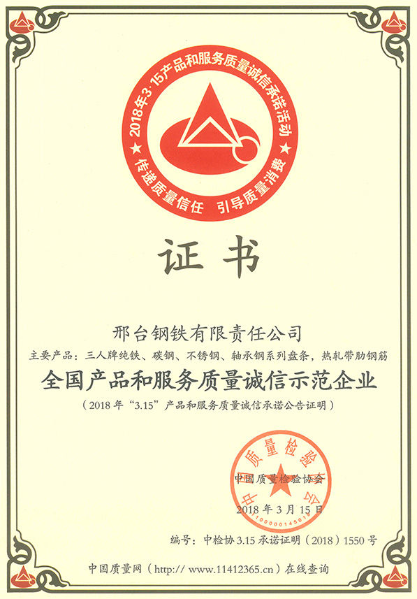 - On March 15th, Xingtai Steel (main products: pure iron, carbon steel, stainless steel, hot rolled ribbed steel bar and bearing steel wire rod of Three Person Brand) was awarded the title of "National Product and Service Quality Integrity Model Enterprises" by China Association for Quality Inspecti…