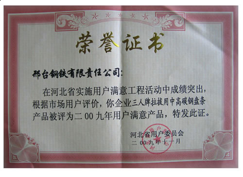 三人牌拉拔用中高碳鋼盤(pán)條被評(píng)為2009年河北省用戶(hù)滿意產(chǎn)品