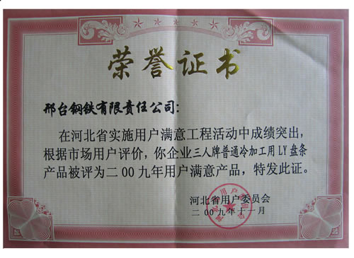 三人牌普通冷加工用LY盤(pán)條被評(píng)為2009年河北省用戶(hù)滿意產(chǎn)品