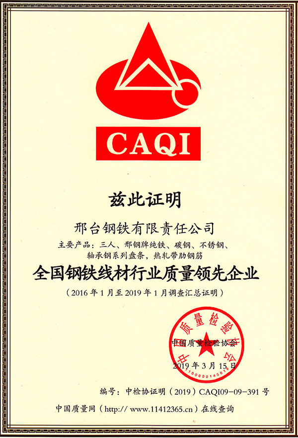 2019年3月15日,邢鋼(主要產(chǎn)品:三人、邢鋼牌純鐵、碳鋼、不銹鋼、軸承鋼系列盤條,熱軋帶肋鋼筋),被中國質(zhì)量檢驗(yàn)協(xié)會(huì)授予“全國鋼鐵線材行業(yè)質(zhì)量領(lǐng)先企業(yè)”稱號(hào)。