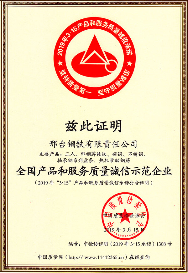 2019年3月15日,邢鋼(主要產(chǎn)品:三人、邢鋼牌純鐵、碳鋼、不銹鋼、軸承鋼系列盤條,熱軋帶肋鋼筋),被中國質(zhì)量檢驗(yàn)協(xié)會(huì)授予“全國產(chǎn)品和服務(wù)質(zhì)量誠信示范企業(yè)”稱號(hào)。