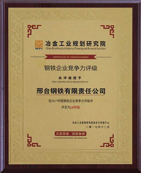 2018年3月15日,邢鋼(主要產(chǎn)品:三人牌純鐵、碳鋼、不銹鋼、軸承鋼系列盤(pán)條和熱軋帶肋鋼筋),被中國(guó)質(zhì)量檢驗(yàn)協(xié)會(huì)授予“全國(guó)產(chǎn)品和服務(wù)質(zhì)量誠(chéng)信示范企業(yè)”稱號(hào)。
