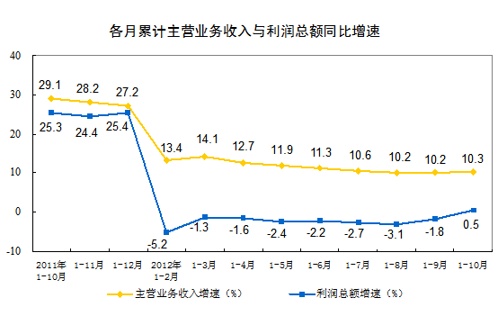 1-10月份,全國規(guī)模以上工業(yè)企業(yè)實現(xiàn)利潤40240億元,同比增長0.5%。10月當(dāng)月實現(xiàn)利潤5001億元,同比增長20.5%。