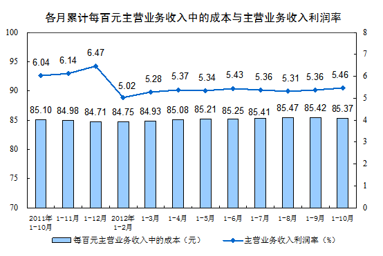 規(guī)模以上工業(yè)企業(yè)實現(xiàn)主營業(yè)務(wù)收入736970億元,同比增長10.3%。每百元主營業(yè)務(wù)收入中的成本為85.37元,主營業(yè)務(wù)收入利潤率為5.46%。
