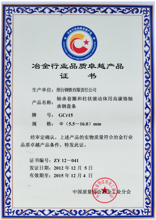 邢鋼公司生產(chǎn)的規(guī)格φ5.5-16mm 軸承鋼GCr15 獲得“冶金行業(yè)品質(zhì)卓越產(chǎn)品”榮譽(yù)稱號(hào),為進(jìn)一步拓展市場(chǎng)、滿足高端用戶的質(zhì)量需求提供了質(zhì)量保證能力。