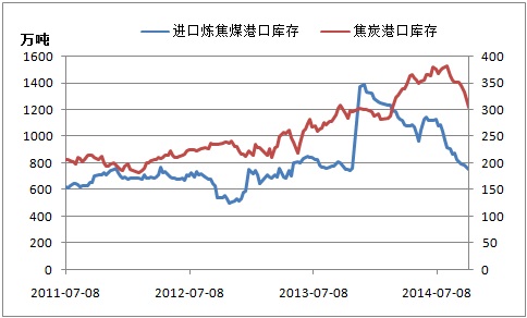 據(jù)我的鋼鐵網(wǎng)監(jiān)測,截至10月10日日照港、連云港、天津港焦炭庫存合計(jì)303.7萬噸,自8月8日達(dá)到380.6萬噸的年內(nèi)最高位之后,港口庫存處于持續(xù)下滑態(tài)勢。不過,國內(nèi)鋼企焦炭庫存仍保持低位,并無明顯補(bǔ)庫意愿,導(dǎo)致焦炭價格暫穩(wěn)運(yùn)行,一旦后期鋼價持續(xù)堅(jiān)挺,或推動鋼企入市采購。