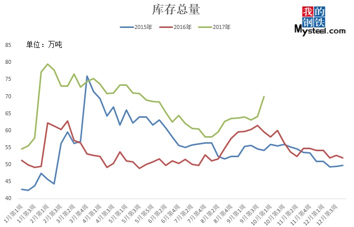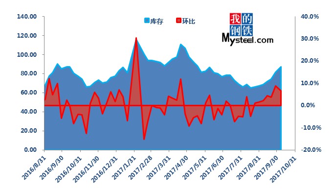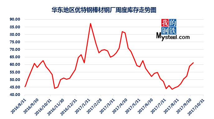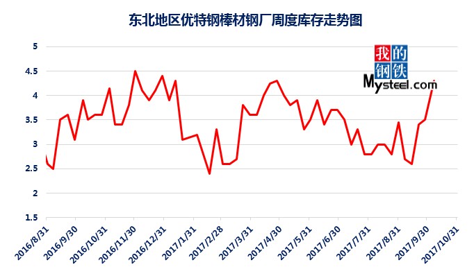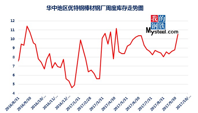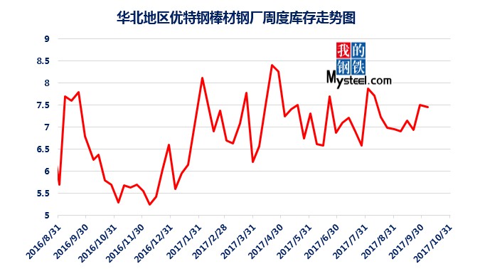 據(jù)mysteel統(tǒng)計(jì)的樣本優(yōu)特鋼廠庫存顯示,現(xiàn)全國優(yōu)特鋼廠棒材總庫存86.92萬噸,較國慶節(jié)前增加5.67萬噸,環(huán)比增加6.5%,較2016年國慶節(jié)后第一周庫存低0.31萬噸,較2016年均值高9.61萬噸,上漲12.43%。2017年內(nèi)均值為84.43萬噸,當(dāng)前庫存較均值增加2.49萬噸。樣本鋼廠總庫存連續(xù)7周上漲。