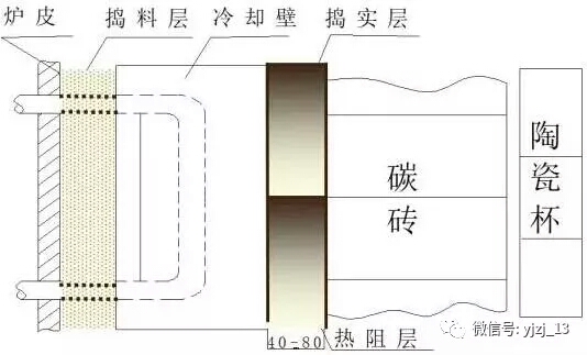 高爐爐缸由外至內(nèi)通常包括爐皮、搗料層、冷卻壁、搗實層、碳磚、陶瓷杯、黏土磚等,其中,黏土磚在高爐開爐后2個月內(nèi)脫落。高爐正常生產(chǎn)時爐缸鐵水與爐墻陶瓷杯或碳磚之間生成一層爐渣、鐵水、碳磚、含鈦難融物組成的保護層,這就是我們所說的“高爐爐缸自保護層”。