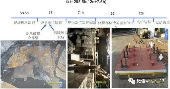 割除燒穿區(qū)域燒損的5塊冷卻壁,并清理燒穿部位的殘渣、爐料,摳除部分燒損炭磚,露出砌筑接口。