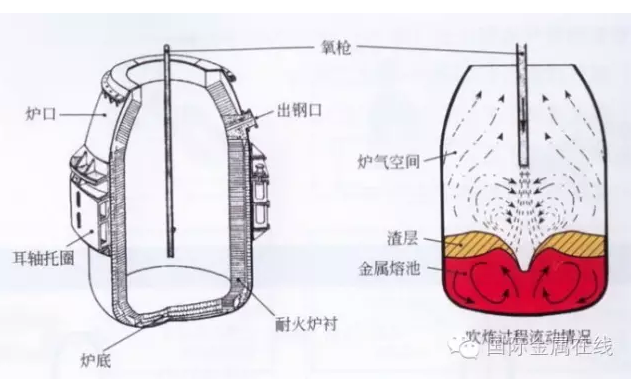 爐料通常為鐵水、廢鋼和造渣材料;也可加入少量冷生鐵和鐵礦石。通過氧槍從熔池上面向下吹入高壓的純氧(含O299.5%以上),氧化去除鐵水中的硅、錳、碳和磷等元素,并通過造渣進行脫磷和脫硫。各種元素氧化所產生的熱量,加熱了熔池的液態(tài)金屬,使鋼水達到現(xiàn)定的化學成分和溫度。它主要用于冶煉非合金鋼和低合金鋼;但通過精煉手段,也可用于冶煉不銹鋼等合金鋼。