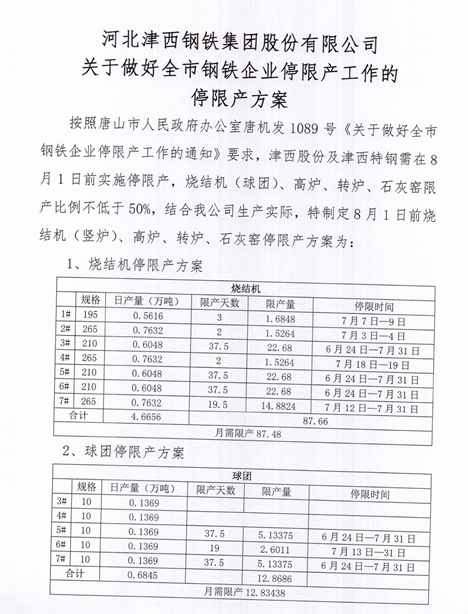 1、高爐限產50%,6月25日0時—7月12日12時停產,7月12日12時—7月31日正常生產,共停機17.5天。