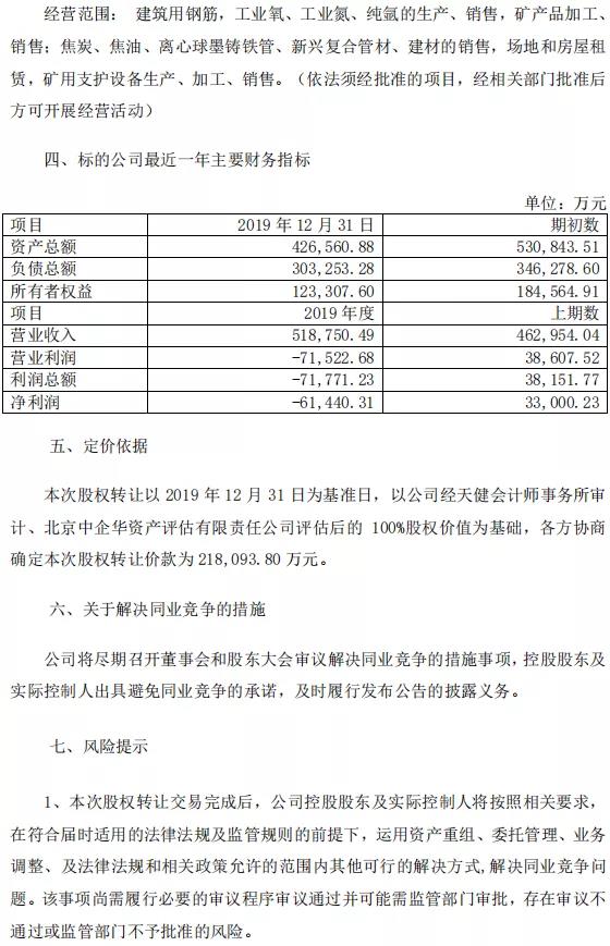 11月13日晚間,八一鋼鐵發(fā)布公告稱,該公司控股股東寶鋼集團(tuán)新疆八一鋼鐵有限公司的控股子公司新疆天山鋼鐵聯(lián)合有限公司擬受讓深圳九天清控投資合伙企業(yè)持有的新興鑄管新疆有限公司100%股權(quán)。11月13日,天山鋼鐵與九天清控簽署了《股權(quán)轉(zhuǎn)讓協(xié)議》。本次股權(quán)轉(zhuǎn)讓以2019年12月31日為基準(zhǔn)日,以公司經(jīng)天健會計師事務(wù)所審計、北京中企華資產(chǎn)評估有限責(zé)任公司評估后的100%股權(quán)價值為基礎(chǔ),各方協(xié)商確定本次股權(quán)轉(zhuǎn)讓價款為21.81億元。