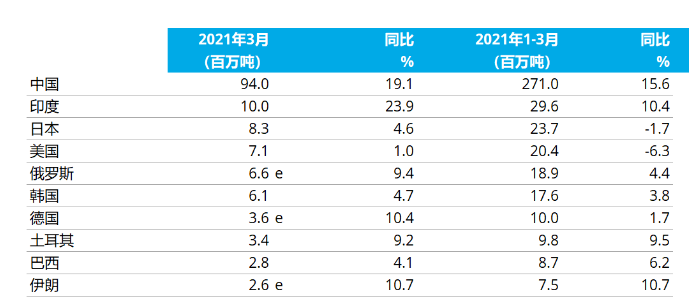 2021年3月,中國粗鋼產量為9400萬噸,同比提高19.1%;