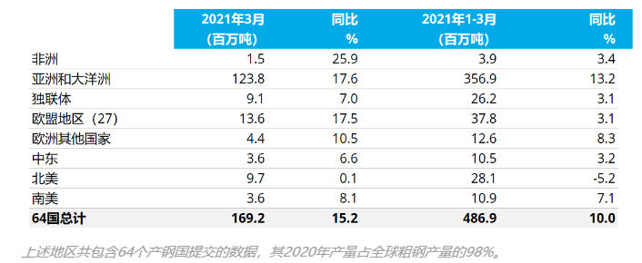 2021年3月全球64個納入世界鋼鐵協(xié)會統(tǒng)計國家的粗鋼產量為1.692億噸,同比提高15.2%。