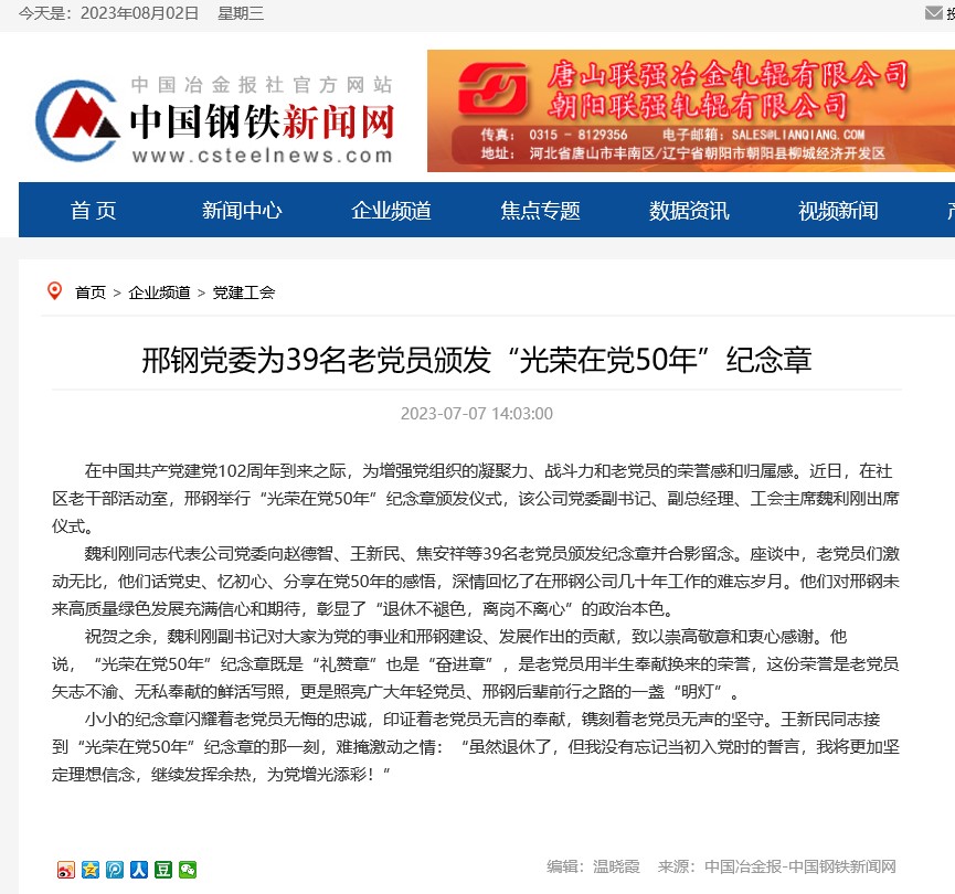 魏利剛同志代表公司黨委向趙德智、王新民、焦安祥等39名老黨員頒發(fā)紀(jì)念章并合影留念。座談中,老黨員們激動無比,他們話黨史、憶初心、分享在黨50年的感悟,深情回憶了在邢鋼公司幾十年工作的難忘歲月。他們對邢鋼未來高質(zhì)量綠色發(fā)展充滿信心和期待,彰顯了“退休不褪色,離崗不離心”的政治本色。
