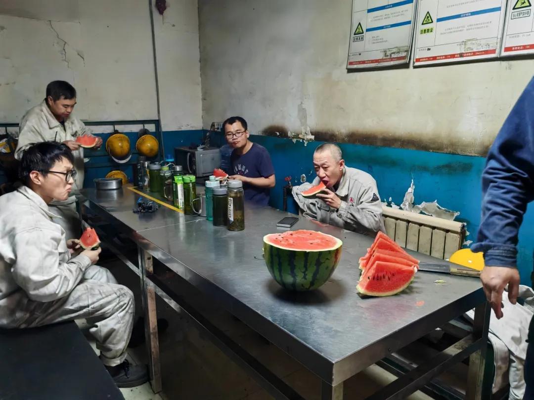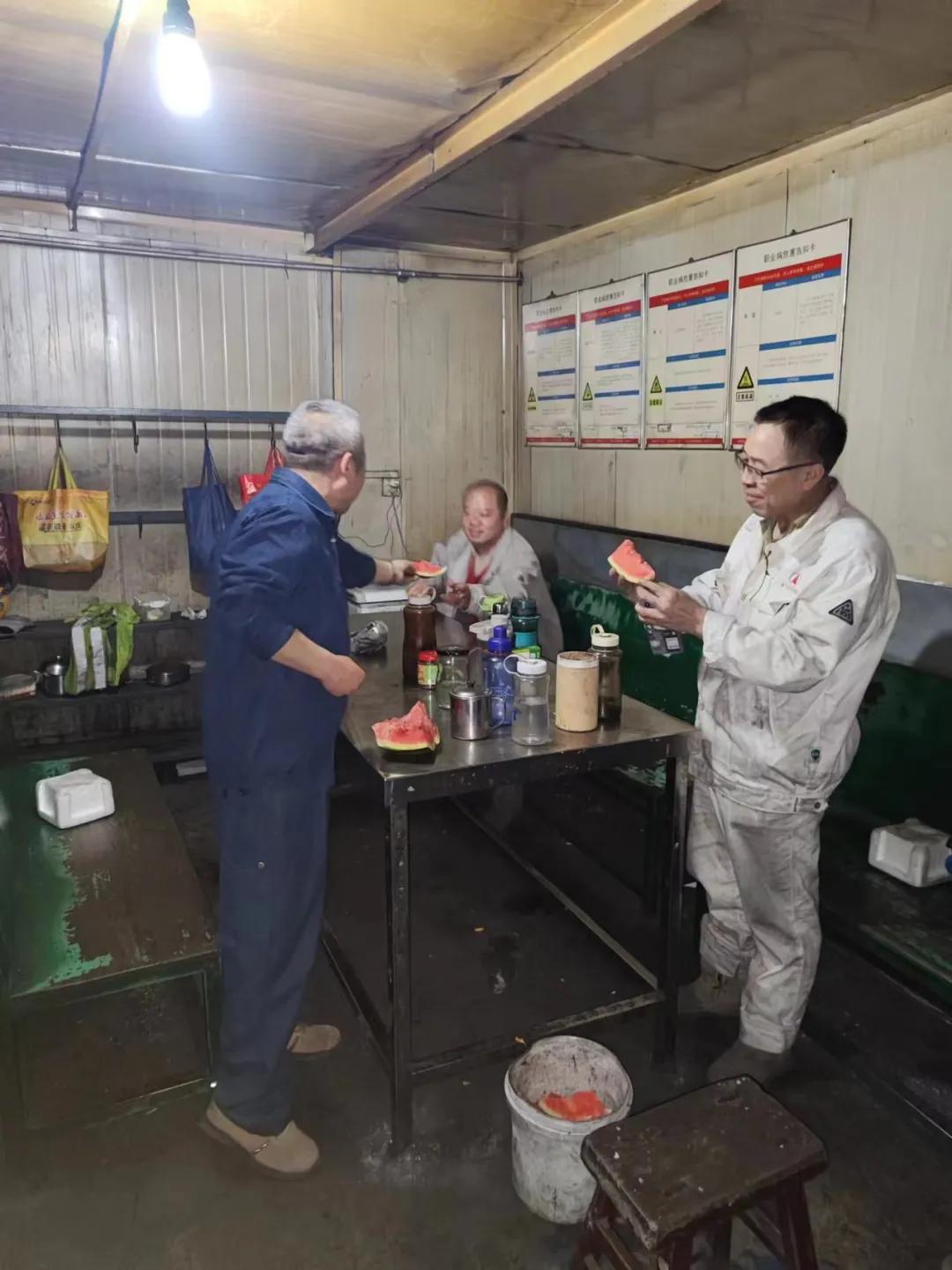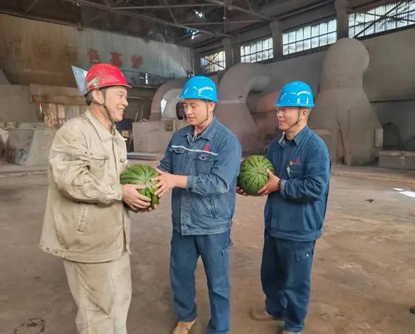 “天氣炎熱,大家辛苦了”,在爐前,侯副總親自把西瓜送到員工手里,并送上節(jié)日的祝福“端午安康!”希望大家在工作中注意做好防暑降溫,避免中暑,工作中合理分配體力,既要保證西場(chǎng)主溝澆筑過(guò)程安全,又要保證東場(chǎng)單場(chǎng)出鐵過(guò)程安全。在二燒混合機(jī)檢修現(xiàn)場(chǎng),侯總了解檢修進(jìn)度,叮囑維修、燒結(jié)車間主任,要注意檢修過(guò)程人員安全,保證檢修質(zhì)量,為二燒設(shè)備穩(wěn)定運(yùn)行奠定基礎(chǔ)。
