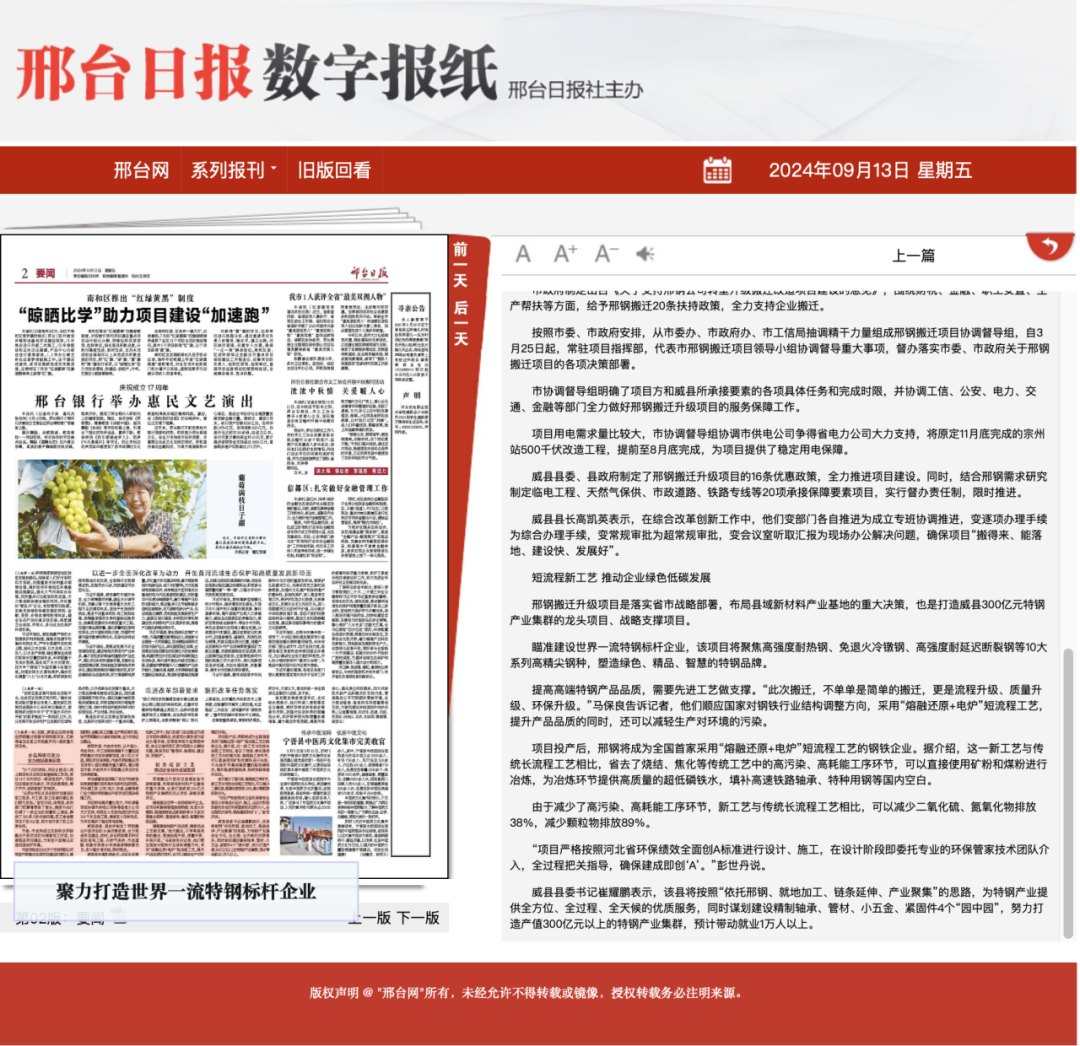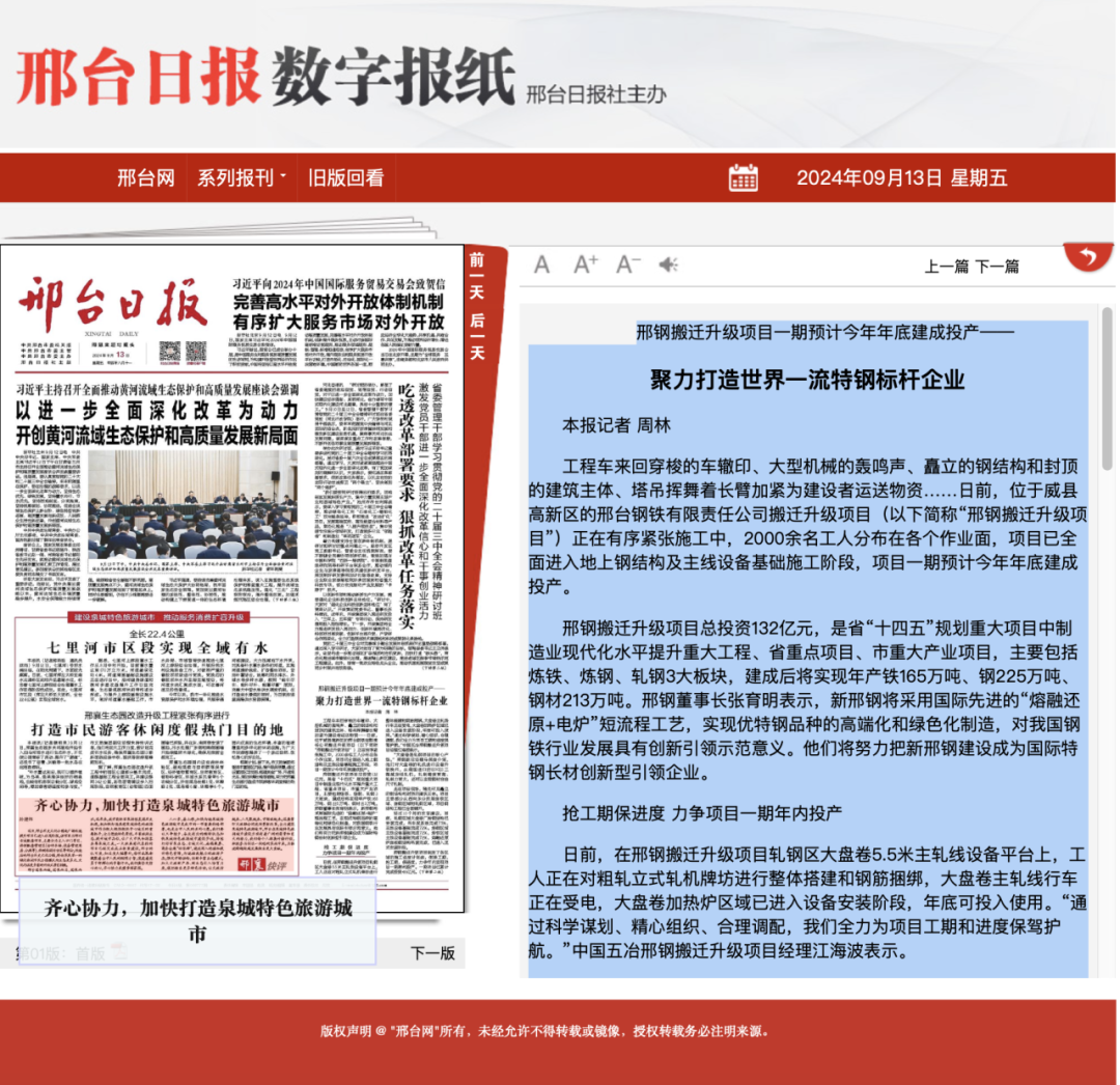 邢臺(tái)日?qǐng)?bào):邢鋼搬遷升級(jí)項(xiàng)目一期預(yù)計(jì)今年年底建成投產(chǎn)