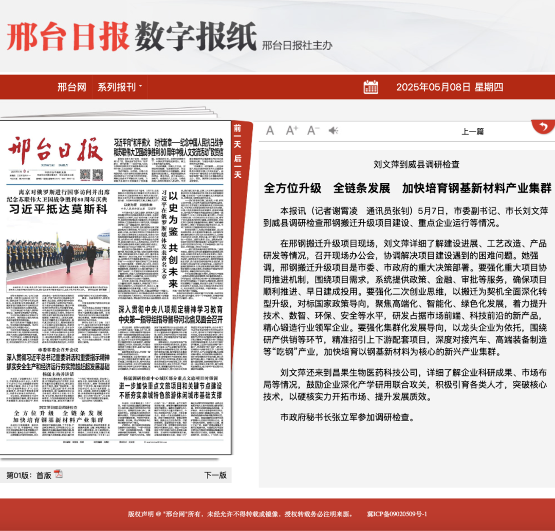 本報(bào)訊(記者謝霄凌 通訊員張釗)5月7日,市委副書記、市長劉文萍到威縣調(diào)研檢查邢鋼搬遷升級項(xiàng)目建設(shè)、重點(diǎn)企業(yè)運(yùn)行等情況。